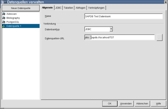 Abbildung 6: Eine neue SAP DB DatenquelleDatenquelle URL: sapdb://localhost/TST