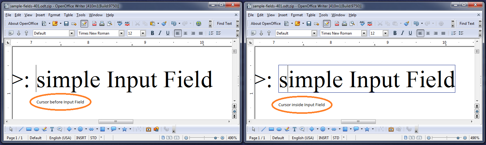 Input Fields can only contain text without formatting. Accordingly, the corresponding edit and insert actions for Input Fields are restricted and character formattings are applied to the complete Input Field. This means no change compared to former OpenOffice versions.